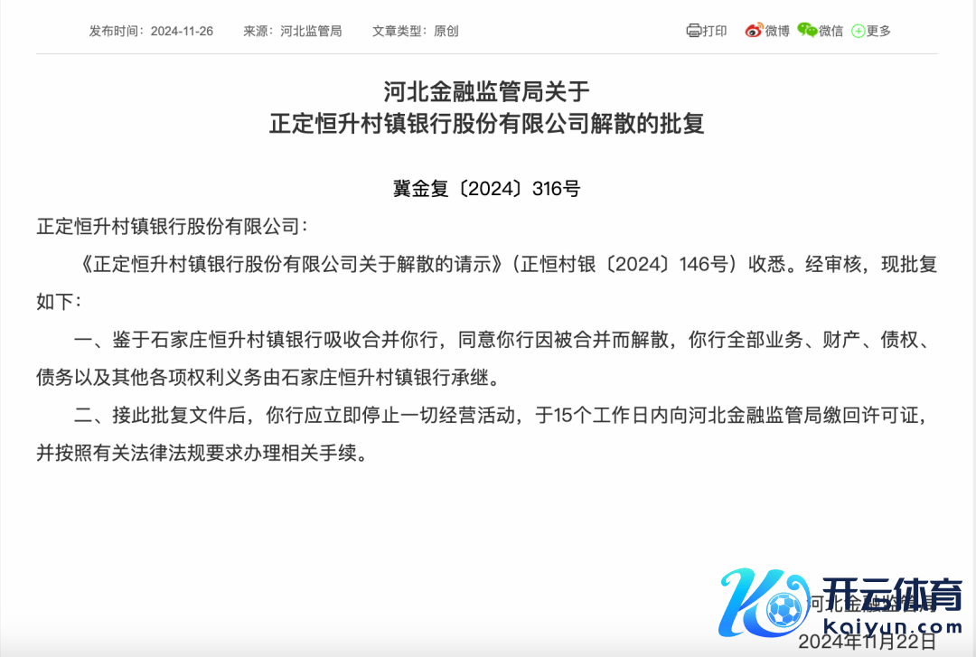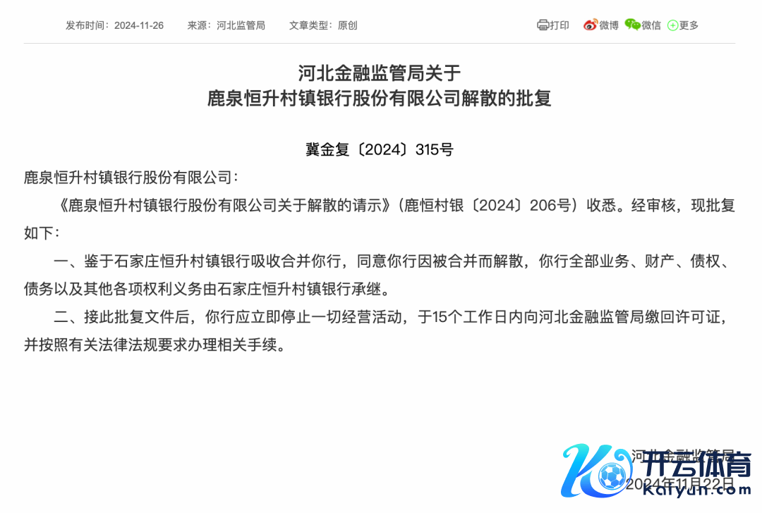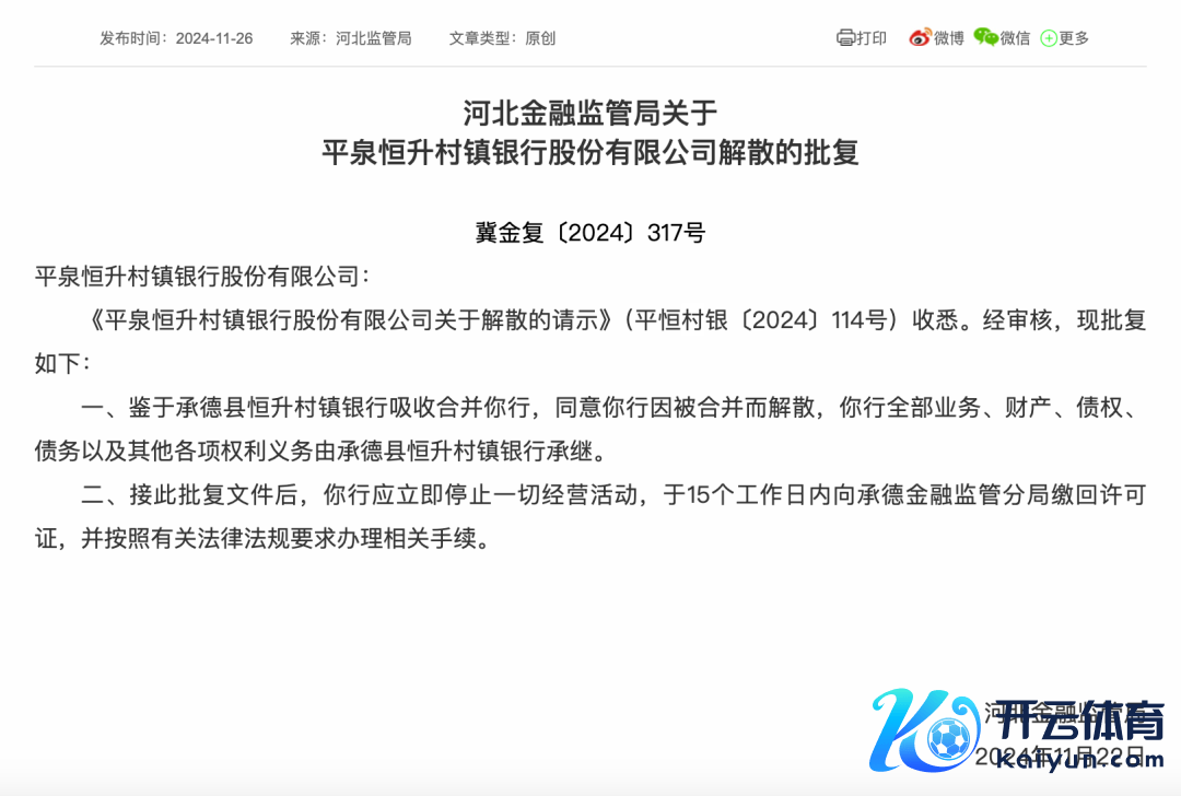 批复文献露馅,由于被承德县恒升村镇银行给与团结,平泉恒升村镇银行于11月22日获批散伙,其一皆业务、财产、债权、债务,以过甚他各项权力义务由承德县恒升村镇银行承继。