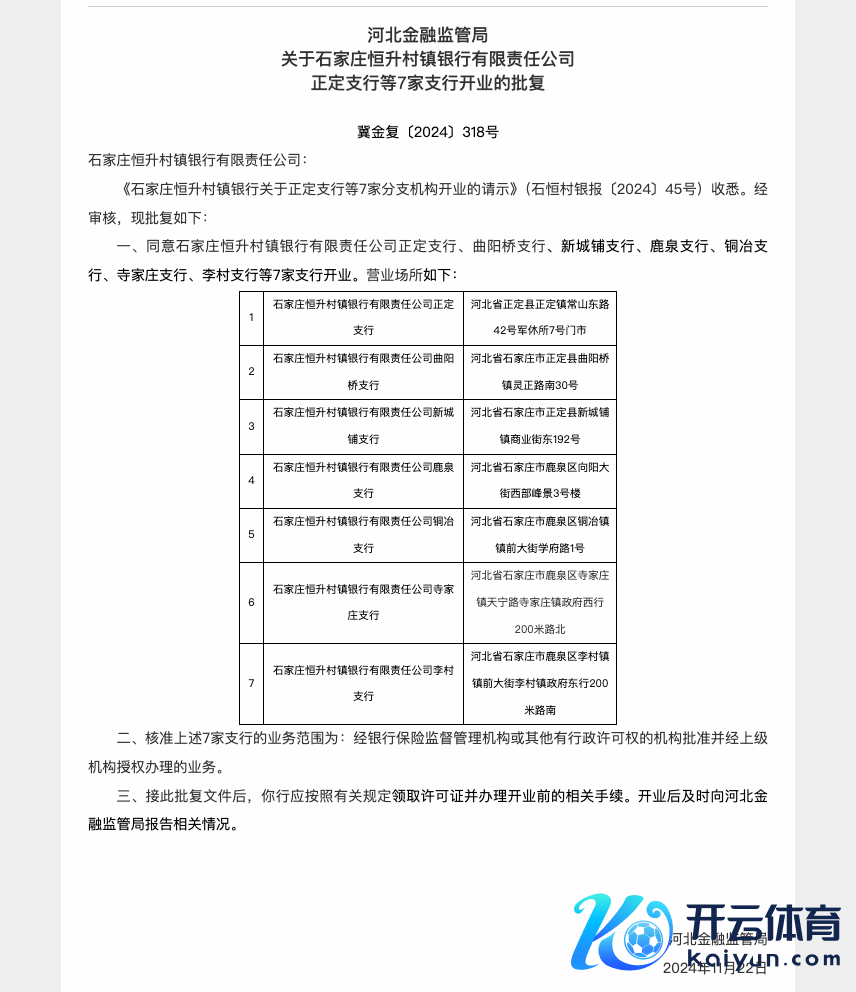 此外,石家庄恒升村镇银行正定支行、曲阳桥支行、新城铺支行、鹿泉支行、铜冶支行、寺家庄支行、李村支行等7家谱行也于11月22日获准开业。