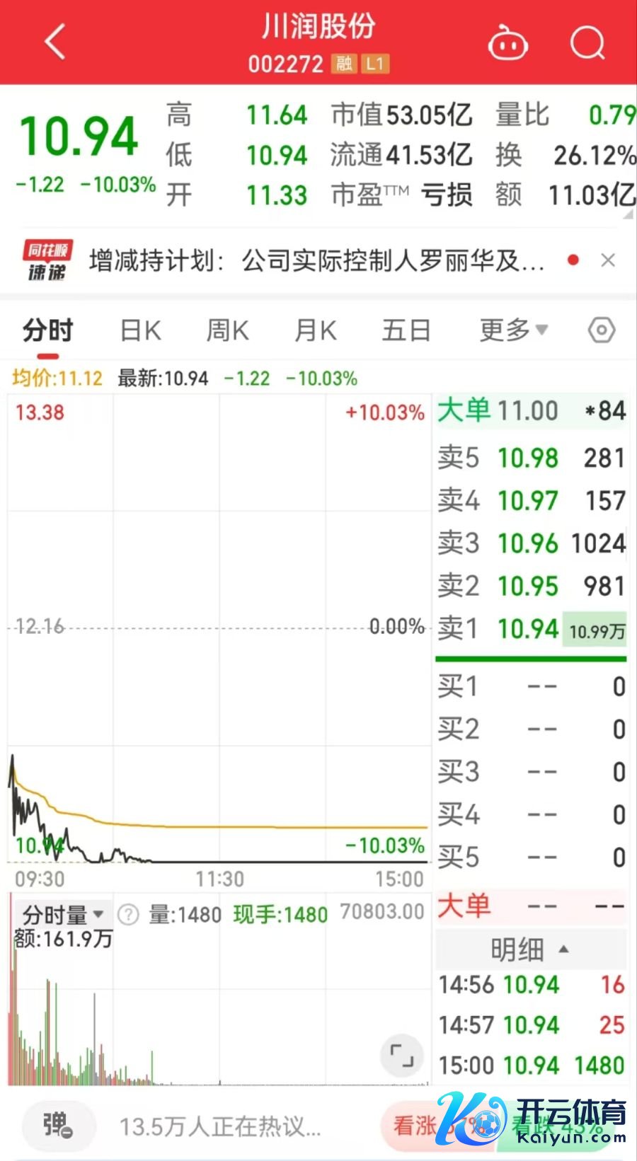 12月30日,川润股份(002272.SZ)低开低走,早盘跌停,放胆收盘封单超1.2亿元,报10.94元/股,总市值53.05亿元。