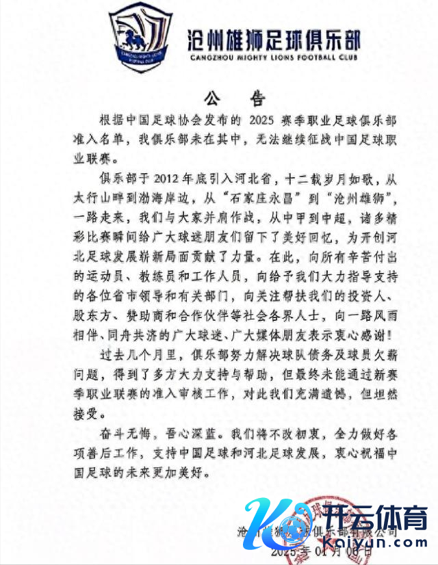 中超球队沧州雄狮发布官方分官方声明,由于球队莫得通过准入认真驱逐。而沧州体式在2011年设立,也曾还拿过2014和2019年的中甲亚军,可是无奈在参加中超之后施展一般,是以也无奈驱逐。除此除外,还有中乙球队湖南湘涛相同也发布公告,退出了中国联赛舞台。这么一来短短一天内两支中国足球俱乐部告示驱逐,两队的球员也不得不从头寻找责任。但比拟起这两支球队,行为也曾昔日中超的八冠王,广州队也相同准入失败,濒临的也很可能是驱逐这一条路。