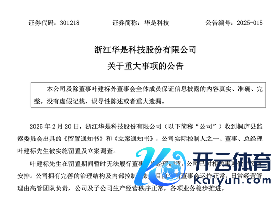 2月21日,华是科技发布公告称,公司于2月20日收到桐庐县监察委员会出具的《留置告知书》和《立案告知书》,公司本色限制东谈主之一、董事、总司理叶建标被扩充留置及立案拜谒。