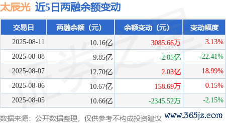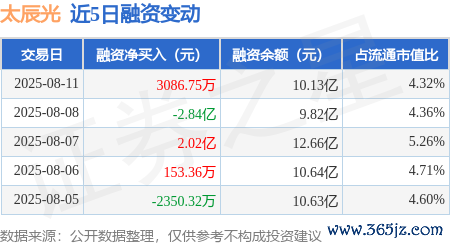 本站音信,8月11日开云体育(中国)官方网站,太辰光(300570)融资买入3.45亿元,融资偿还3.14亿元,融资净买入3086.75万元,融资余额10.13亿元。