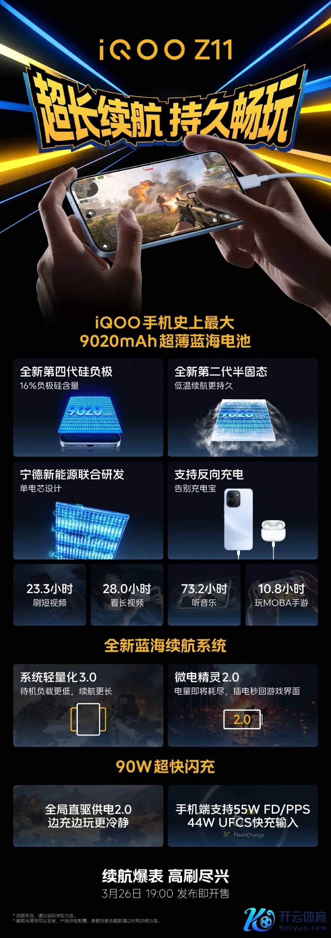 iQOO Z11 续航组合:9020mAh 蓝海电板,90W 有线快充+无线反充,第四代硅负极和第二代半固态时间,硅含量 16%,全局直驱供电 2.0,兼容 55W FD/PPS、44W UFCS。