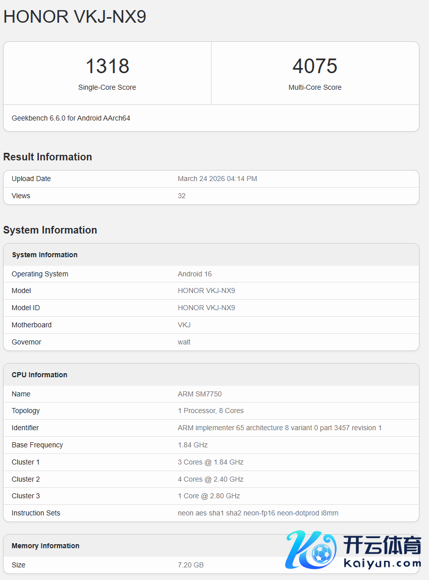 荣耀 600 现身 GeekBench 跑分,单核 1318,多核 4075,搭载骁龙 7 Gen4(SM7750),标配 8GB 。
