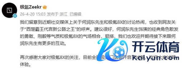 极氪在其应付媒体账号上暗示,介怀到近期对于何润东与极氪8X的推敲。网友建议的“西楚霸王代言新公路之王”的呼声,官方合计建议很好。极氪暗示招供何润东演出的经典脚色所展现的勇敢、鉴定气质与极氪8X的居品气场相契合,并暗示接待并期待接下来与何润东先生有更多的互动。这一趟复被视为对网友命令的正面响应。